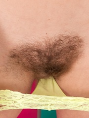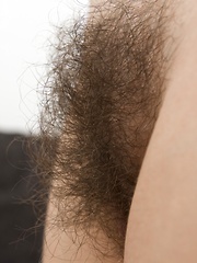 Milena strips her sexy pink lingerie on the sofa and poses sensually baring her unshaven armpit and bushy labia.