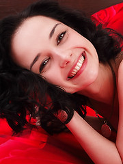 Blonde teen cutie wants you to see her pose in sexy red stockings.