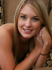 Sultry and luscious blonde with large, puffy breasts, smooth pink labia, and inviting personality.