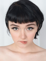 Petite teen with black hair Matilda Bow exposes her hairy armpits and twat