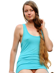Youthful model with petite figure and smooth, nubile assets.
