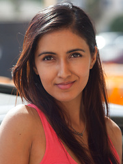 Dressed in a chiffon dress, her hair tied up in a high ponytail, a sweet charming smile lighting up her pretty face, Samera is an enchanting new model posed casually on top of teh couch