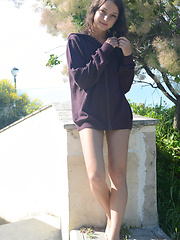 An amazing strip and tease show by a gorgeous skinny teen babe who shows her flawless slim body outdoors at a beach.